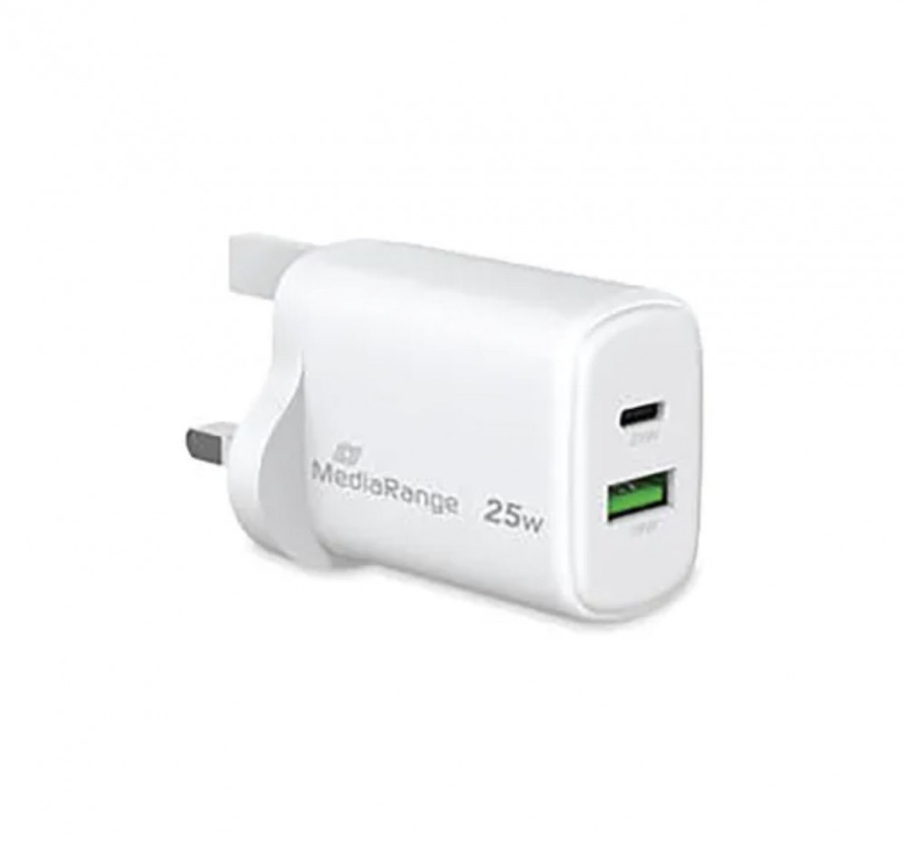 MediaRange GaN Fast Charging Adapter UK Plug 1xUSB-C and 1xUSB-A 25W White MRMA112-UK