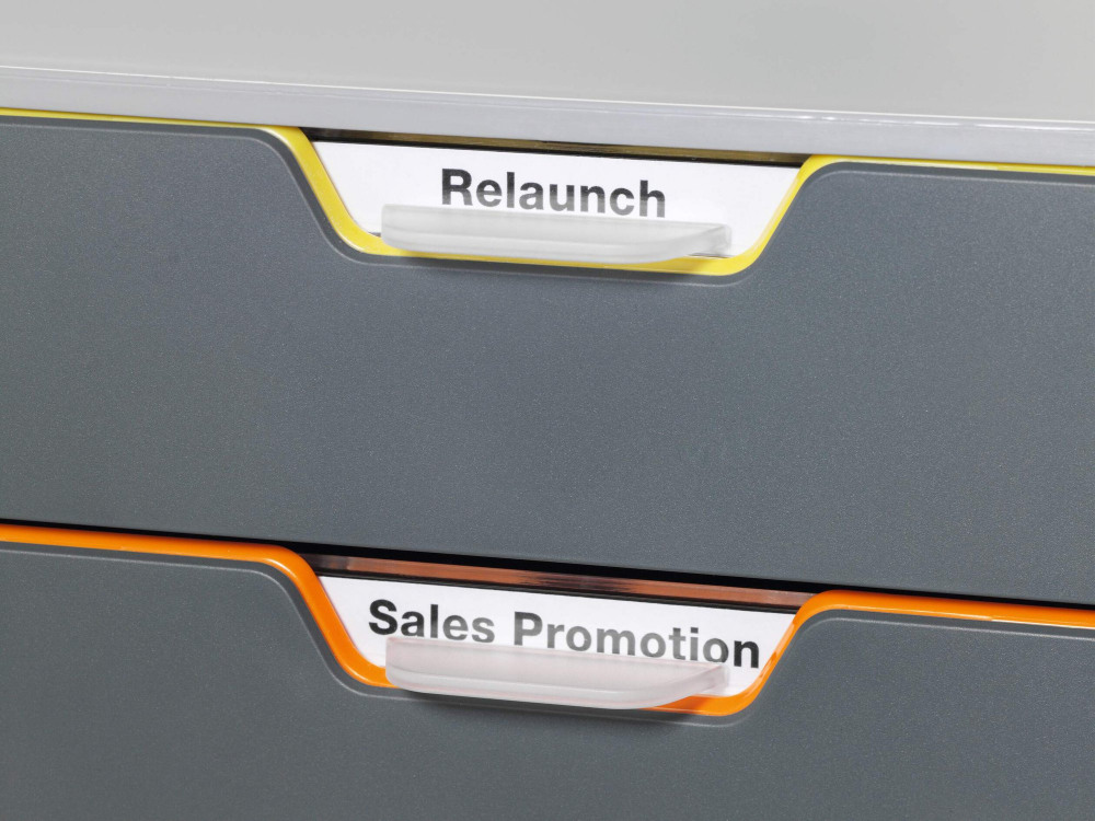 1x VARICOLOR Draw box, 4x Anti-slip adhesive feet, 5x Clear removable labelling windows, 5x Perforated printable label inserts