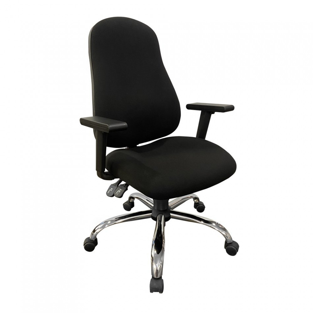 High back operator chair with height adjustable arms and on a chrome base. Blue fabric.