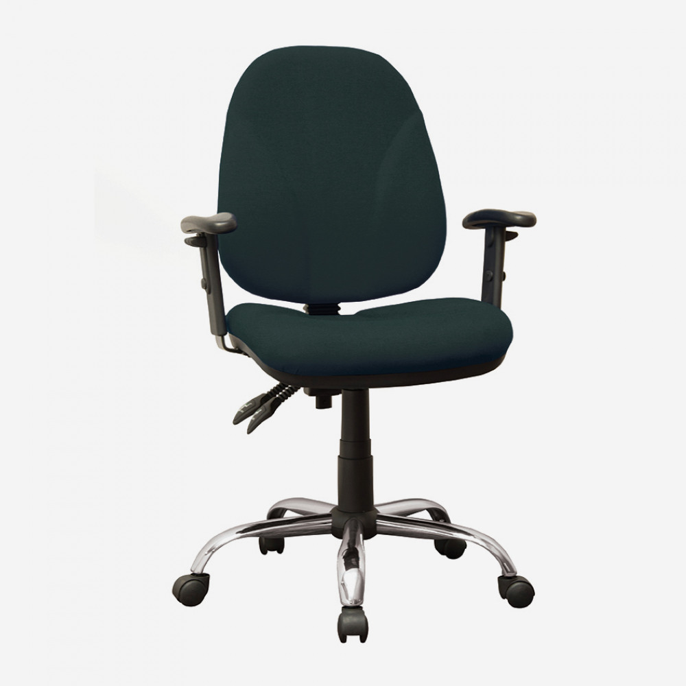 High back operator chair with height adjustable arms and on a chrome base. Black fabric.