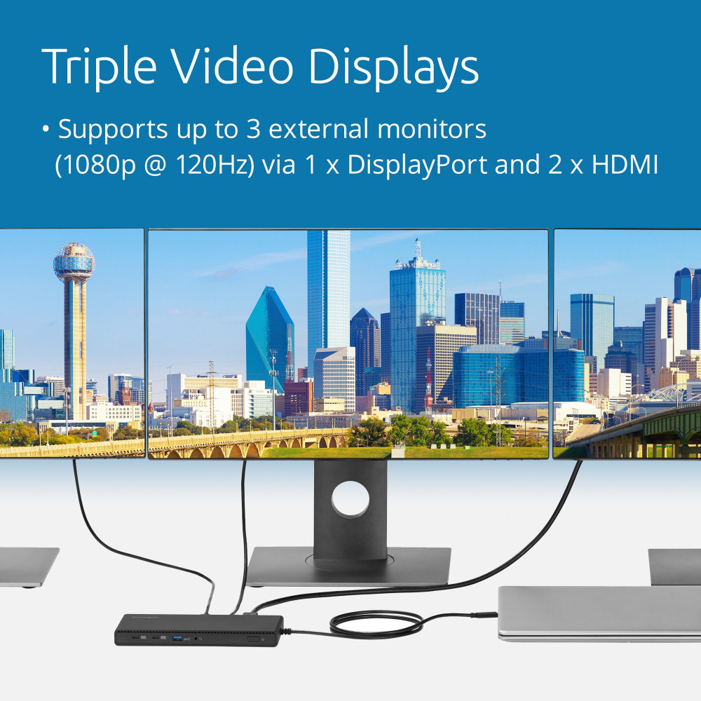 - Supports up to 3 external monitors (1080p @ 120Hz*) via 1 x DP and 2 x HDMI® connections. *For maximum resolution, the DSC-enabled laptop, docking station, monitor and laptop all need to support DSC v1.2.