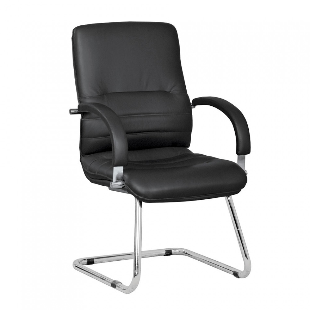 Medium back manager armchair, chrome cantilever frame and fixed padded arms. Black leather.