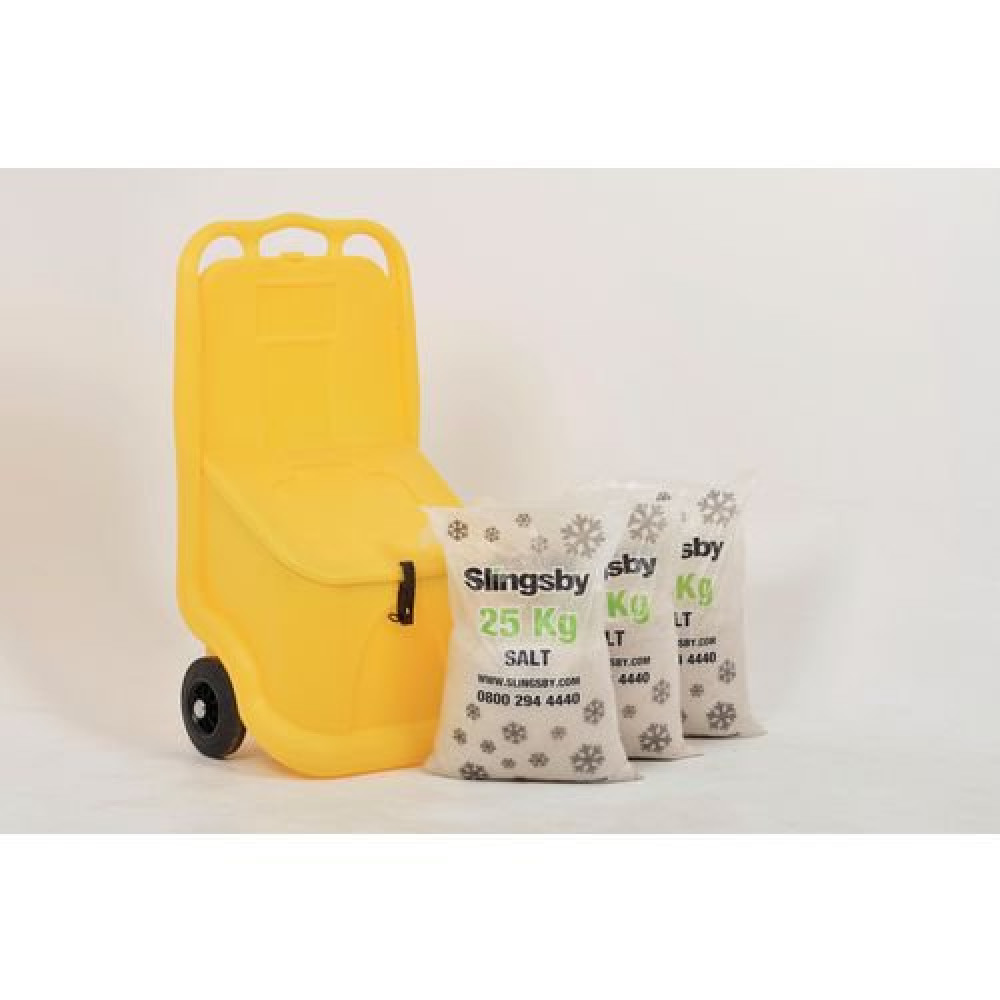 - Kit includes mobile salt bin and 3 x 25kg of high purity white de-icing salt