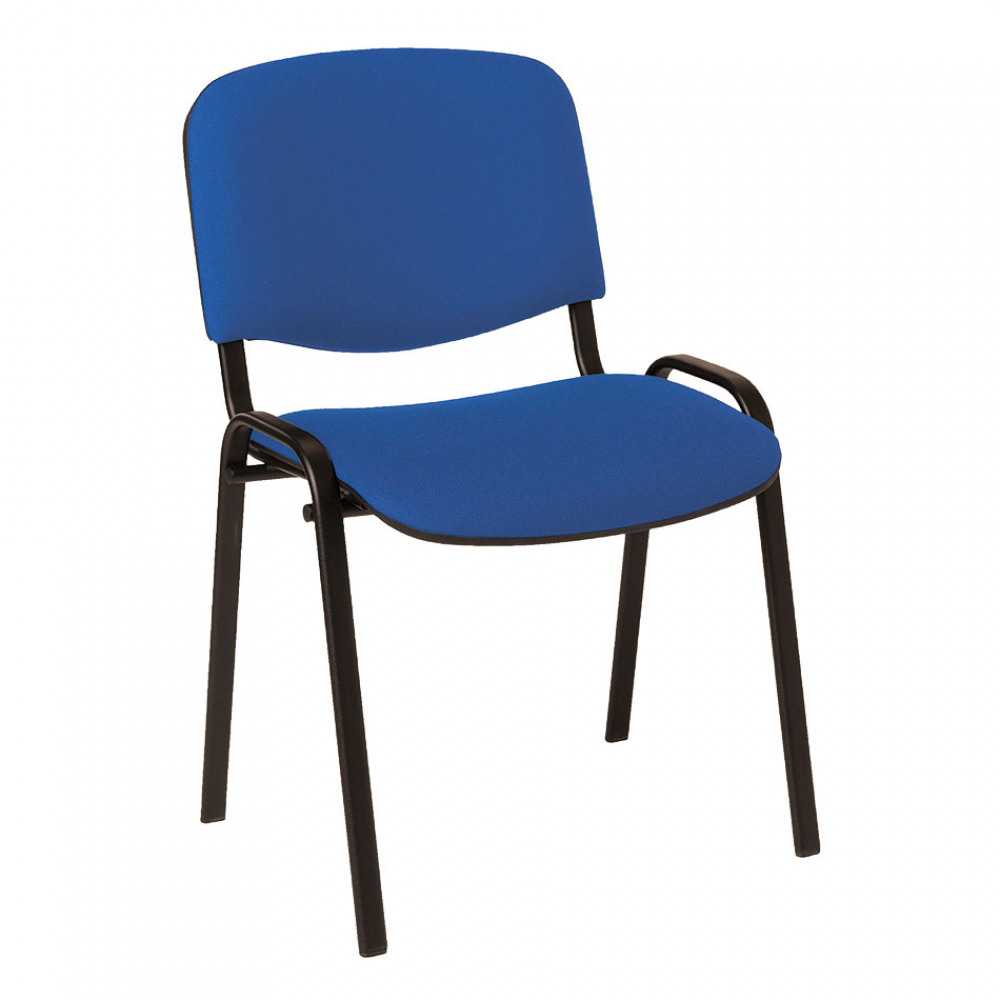 4 leg upholstered stacking side chair with black frame. Blue fabric.
